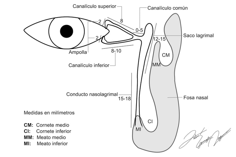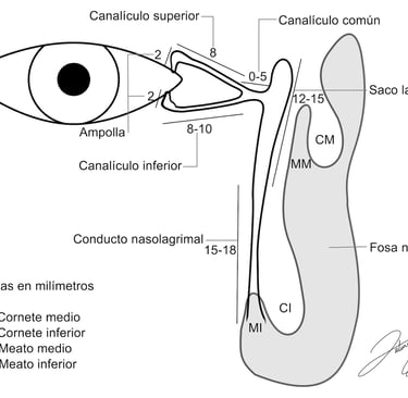 Esquema de vía lagrimal: La lágrima es producida por la glándula lagrimal principal ubicada detrás del hueso de la órbita en la esquina superior externa y muchas glándulas lagrimales accesorias distribuidas en la conjuntiva y detrás de los párpados. La lágrima se distribuye sobre toda la superficie ocular con cada parpadeo y se drena hacia afuera del ojo a través de los puntos lagrimales, uno en el párpado superior y uno en el párpado inferior en la esquina interna del ojo, luego fluye por la ampolla lagrimal y canalículos hacia el saco lagrimal, donde baja por el conducto nasolagrimal hacia la fosa nasal.